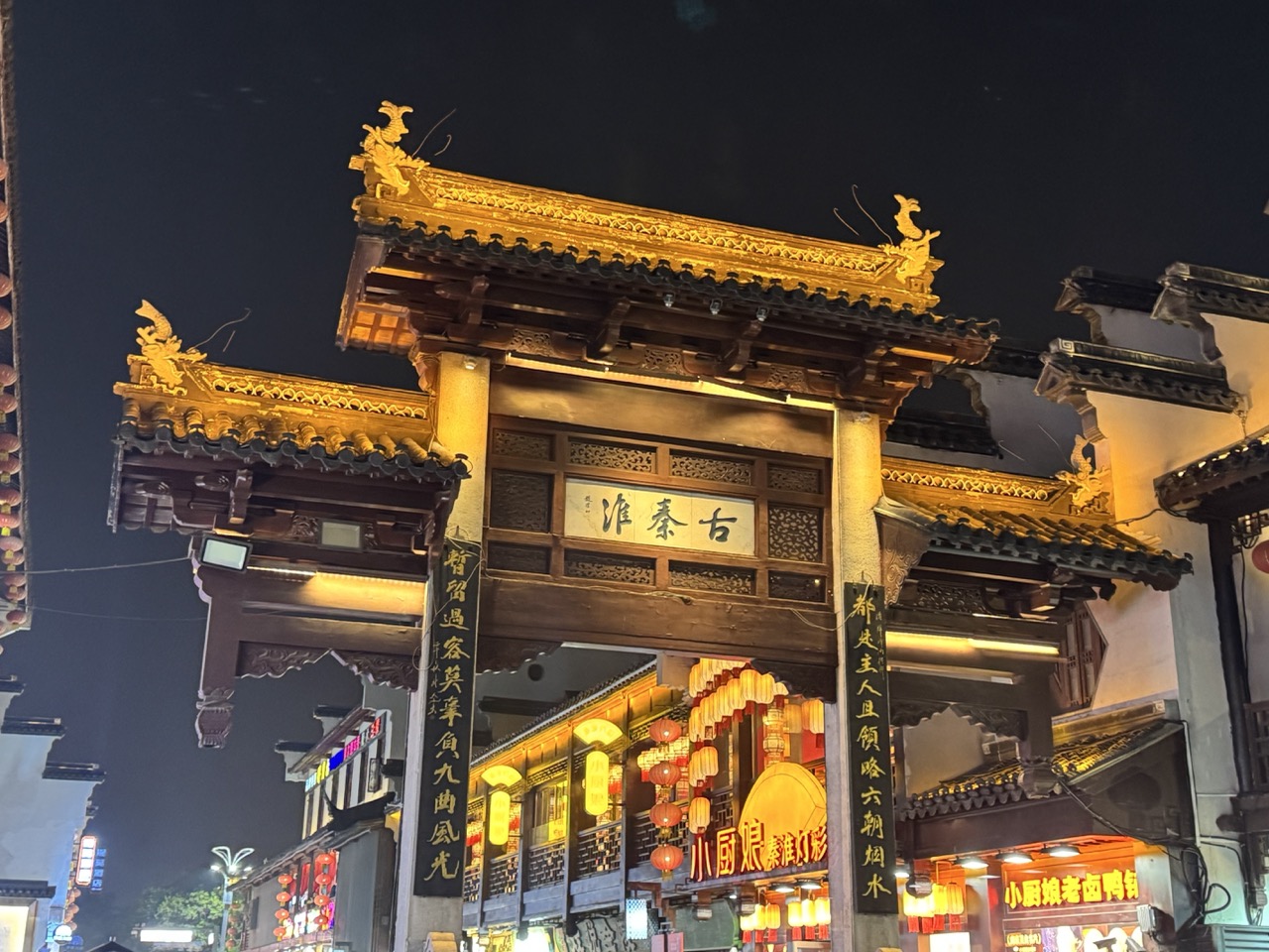 第一站抵达了南京夫子庙。同学们漫步在夜色里的街巷中,被街边琳琅满目的特色小店吸引,纷纷品尝鸭血粉丝汤、盐水鸭等南京特色小吃。