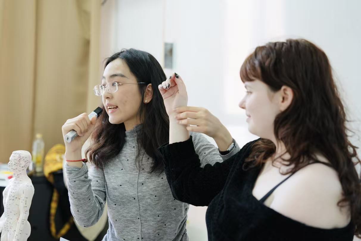 来自世界各地的留学生穿梭于各体验区,在动手实践中感受中华文化的独特魅力。在武术体验区,同学们跟随专业教练学习太极拳的舒缓圆融与少林拳的刚劲有力,在一招一式间领悟"以柔克刚、内外兼修"的中华武学哲学。茶艺环节则让学生们围炉品茗,在茶香氤氲中体验"春风化雨"般的东方生活美学。此外,中医文化区通过把脉问诊、穴位讲解等形式,向国际学生展示传统医学的博大精深;书法体验区则让学子们挥毫泼墨,以笔墨传情;中国结与柳编等手作项目,更让同学们在穿针引线、编织缠绕中体会中国传统工艺的精巧匠心。