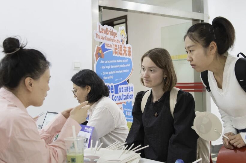 与此同时,普陀区司法局在现场设立了“法律援助专区”,围绕劳动合同签订、实习权益保障等同学们普遍关心的问题进行答疑。专业工作人员结合实际情况提供了清晰、实用的建议,为国际学生在华实习就业提供了有益的法律支持,也增强了大家依法求职、合规发展的意识。