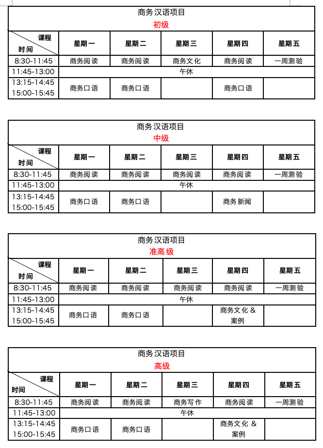 开设从初级到高级不同水平的班级(初级班、中级班、准高级班、高级班)。