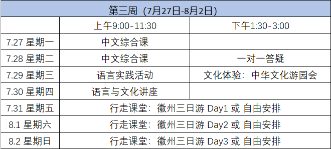 *此费用包含学费、教材、文化体验活动、标准双人间住宿(两人合住,独立卫浴)、欢迎宴、欢送宴、徽州三日游